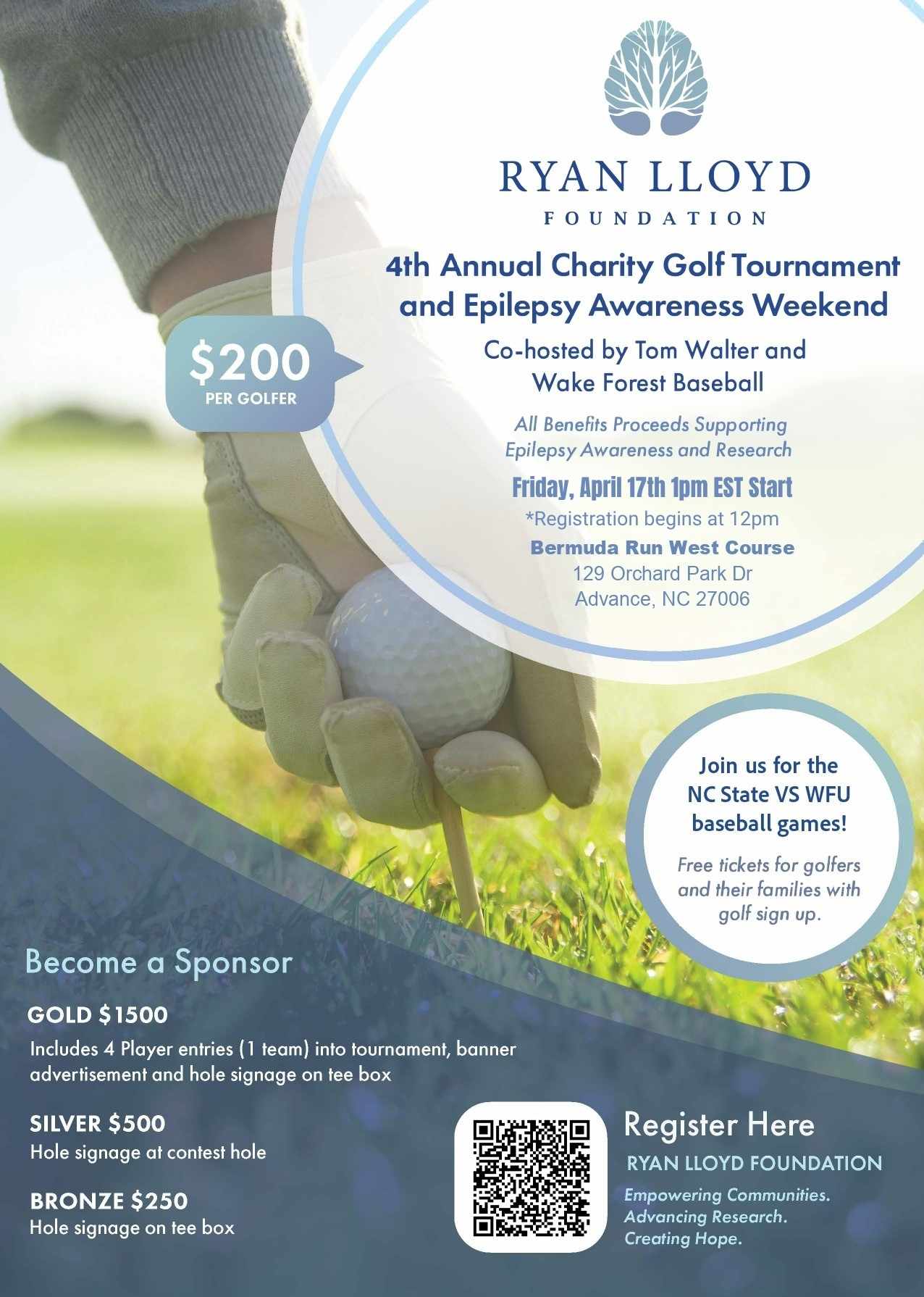Join the Ryan Lloyd Foundation for a great round of golf and the opportunity to play with friends and Wake Forest Baseball Alumni Family to promote a great cause on Friday, April 17th at 1:00PM. Sign up includes a round of Golf and tickets to attend Wake Forest vs Pittsburgh Epilepsy Awareness baseball weekend series.